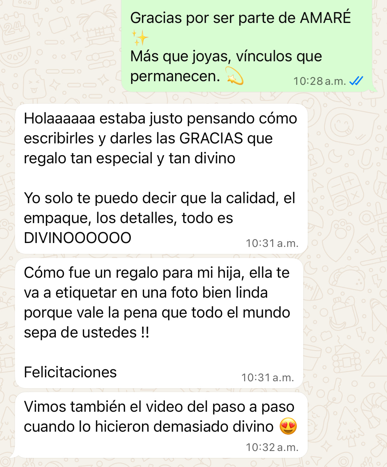 Confiamos en que vas a amar tu joya AMARÉ, como ya lo hacen nuestras miles de clientas felices. Pero si no estás completamente satisfecha, o tu joya llega con algún defecto, te ofrecemos cambios gratuitos o reembolso total. ¡Compra con tranquilidad!